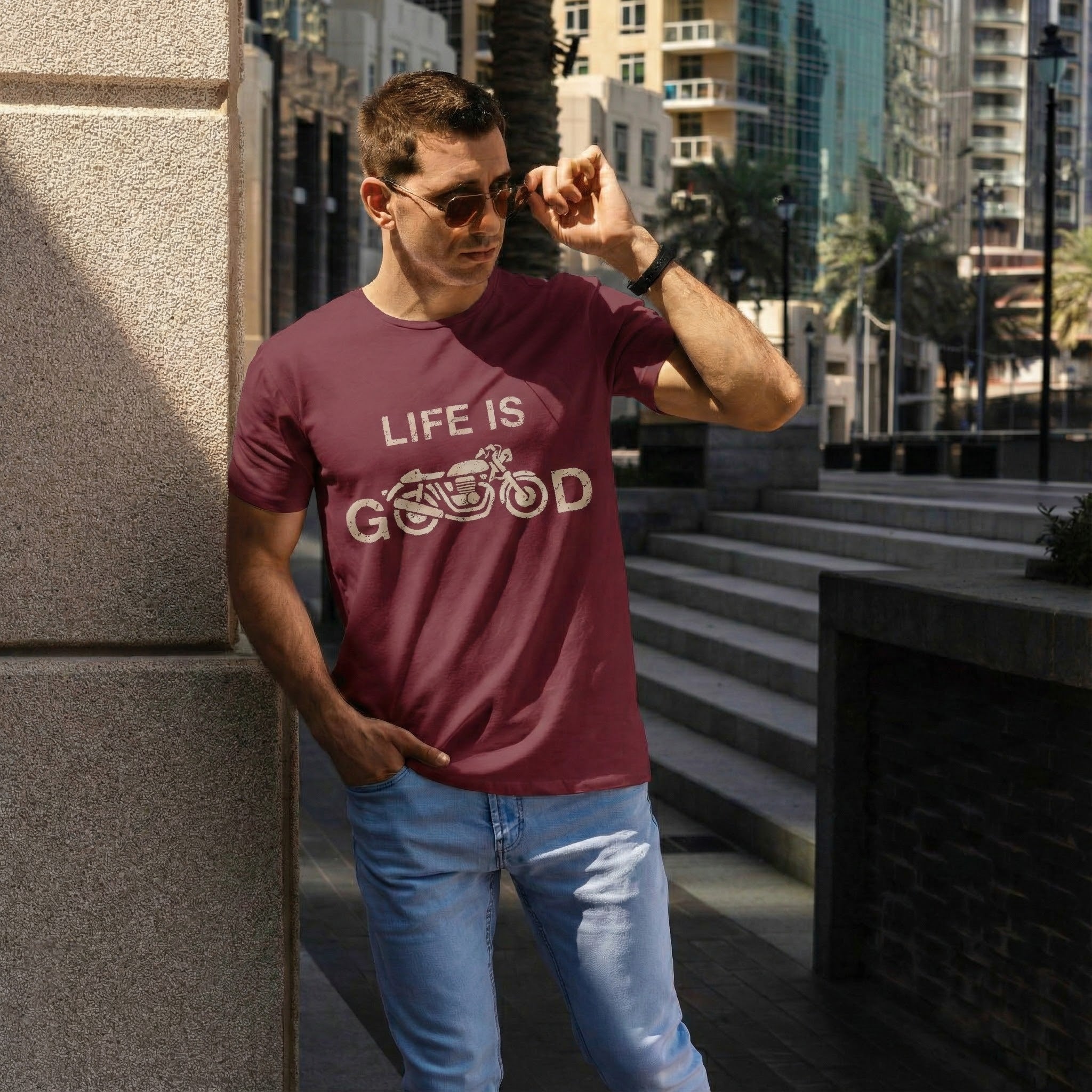 Life Is Good — Vintage Motorcycle Graphic Tee (Burgundy)