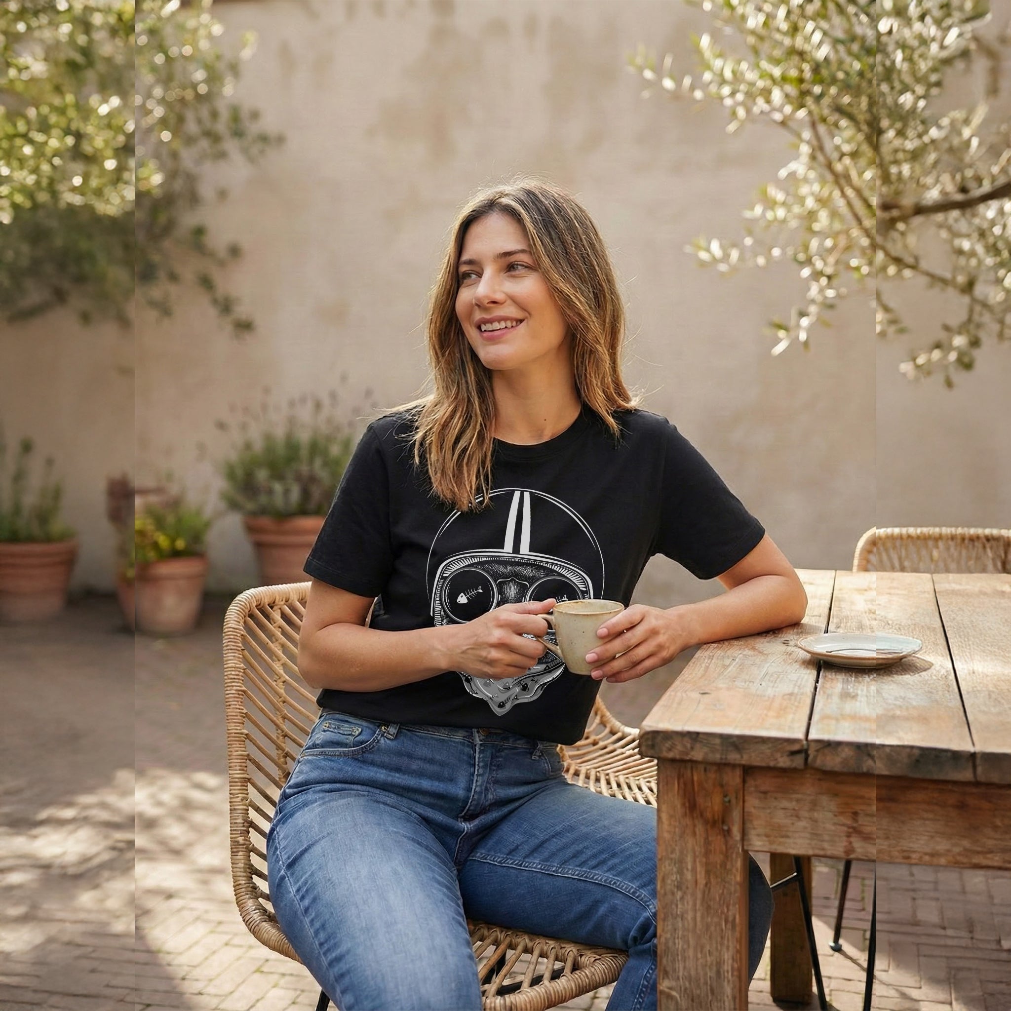 Detaylı çizim, ham bir tavrı hassasiyetle dengeliyor. Kask disiplini, kedi ise sezgiyi simgeliyor. Birlikte, cesur ama sakin, neşeli ama amaçlı bir figür oluşturuyorlar.